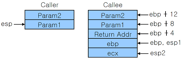 이와 같이 하면 스택의 Top이 계속 바뀌더라도 EBP가 초기의 스택 Top의 위치를 가지고 있으므로 EBP + 8, EBP+ 12과 같은 값으로 접근 가능하다. 위에서 초기에 Callee의 Stack에서 Push ebp를 하고 난 뒤에 Stack의 Top은 esp1을 가르키고 있다. 이 값을 ebp에 넣게 되므로 ebp를 이용하면 Parameter에 고정된 Index( 8, 12, 16...)으로 접근을 할 수 있는 것이다.