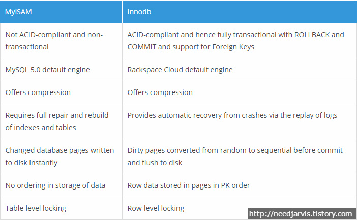 아래는 구글링 후 찾은, MyISAM과 InnoDB를 비교한 내용이다.